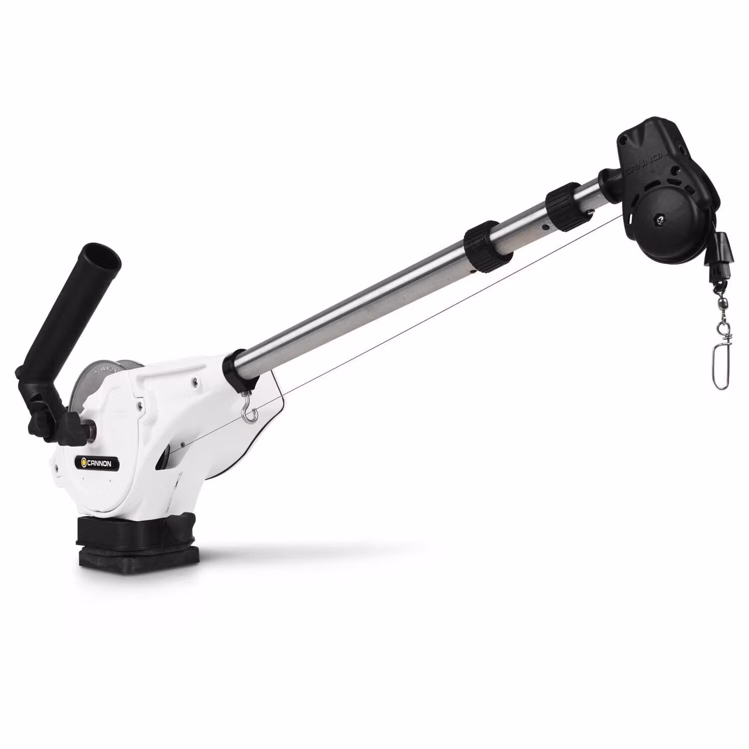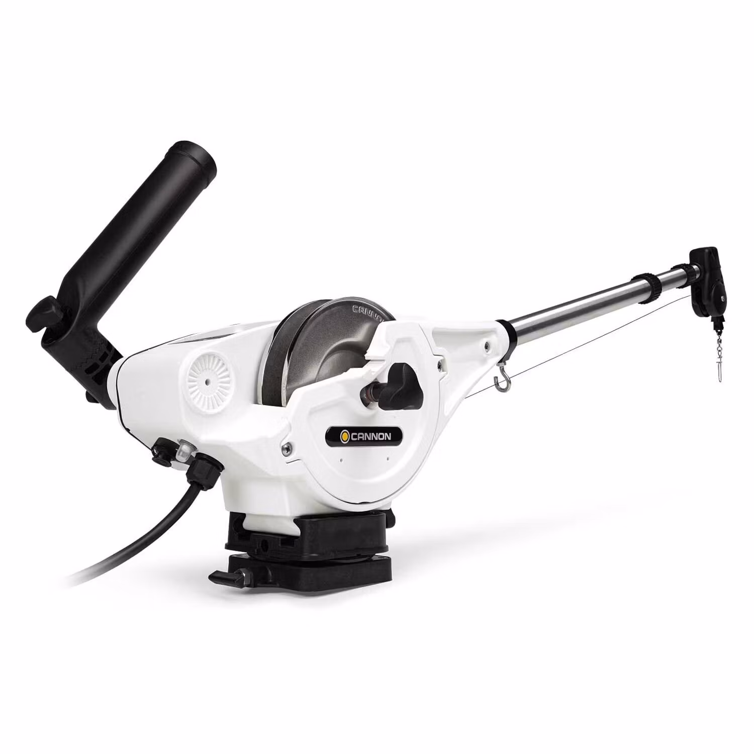 Levereras med justerbar spöhållare, lågprofils 360˚ svirvelfäste, 120m rostfri stålwire, handtag för manuell manövrering och dubbla linutlösare.