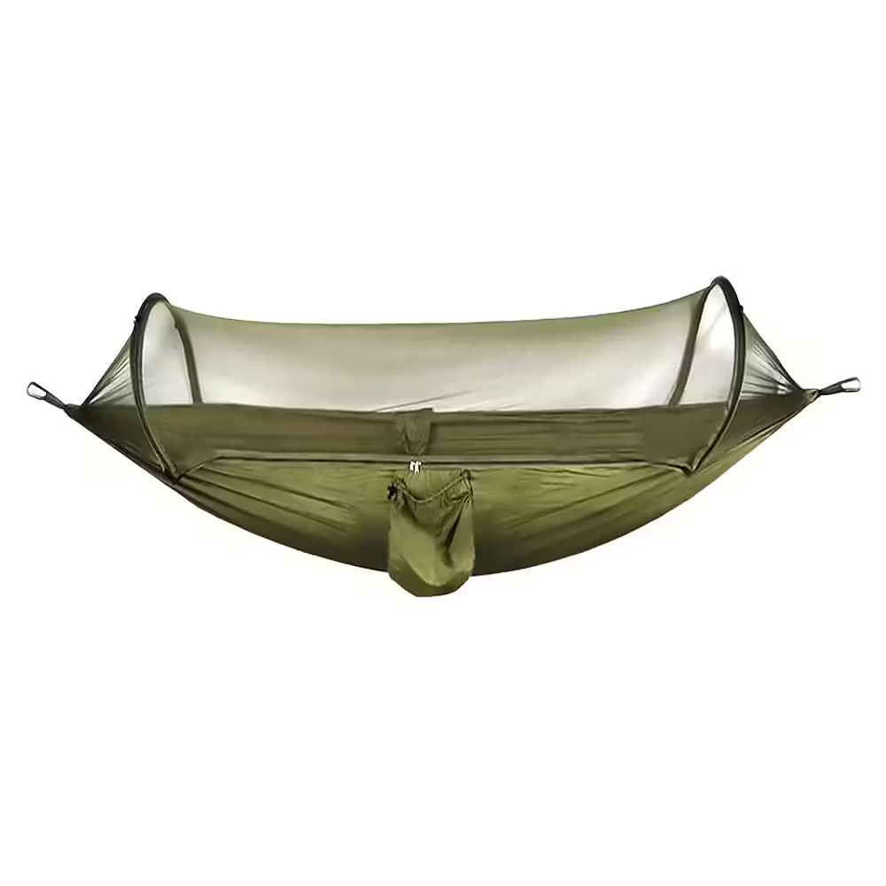 Hängmatta i fallskärmstyg med tillhörande myggnät. Kraftigt rep och karbinhakar medföljer för upphängning. Storlek: 260x140cm.