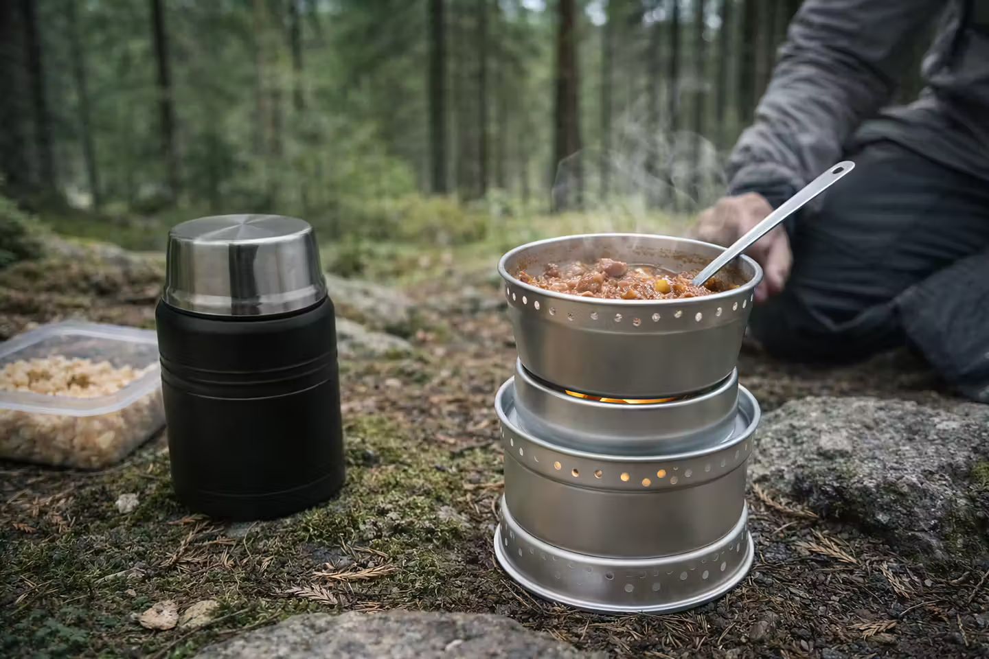 Stormkök som består av en sockel, vindskydd/hållare, brännare, två kastruller, en stekpanna och handtag. Stekpannan kan användas som lock till kastrullerna.